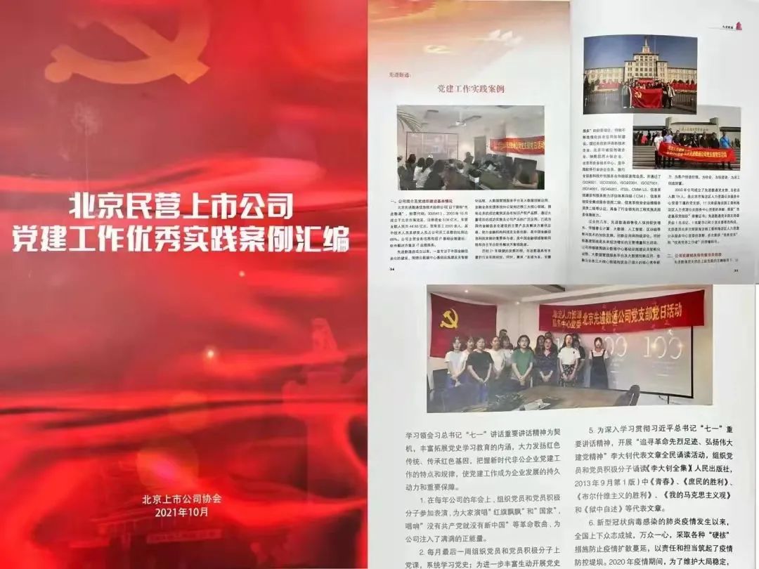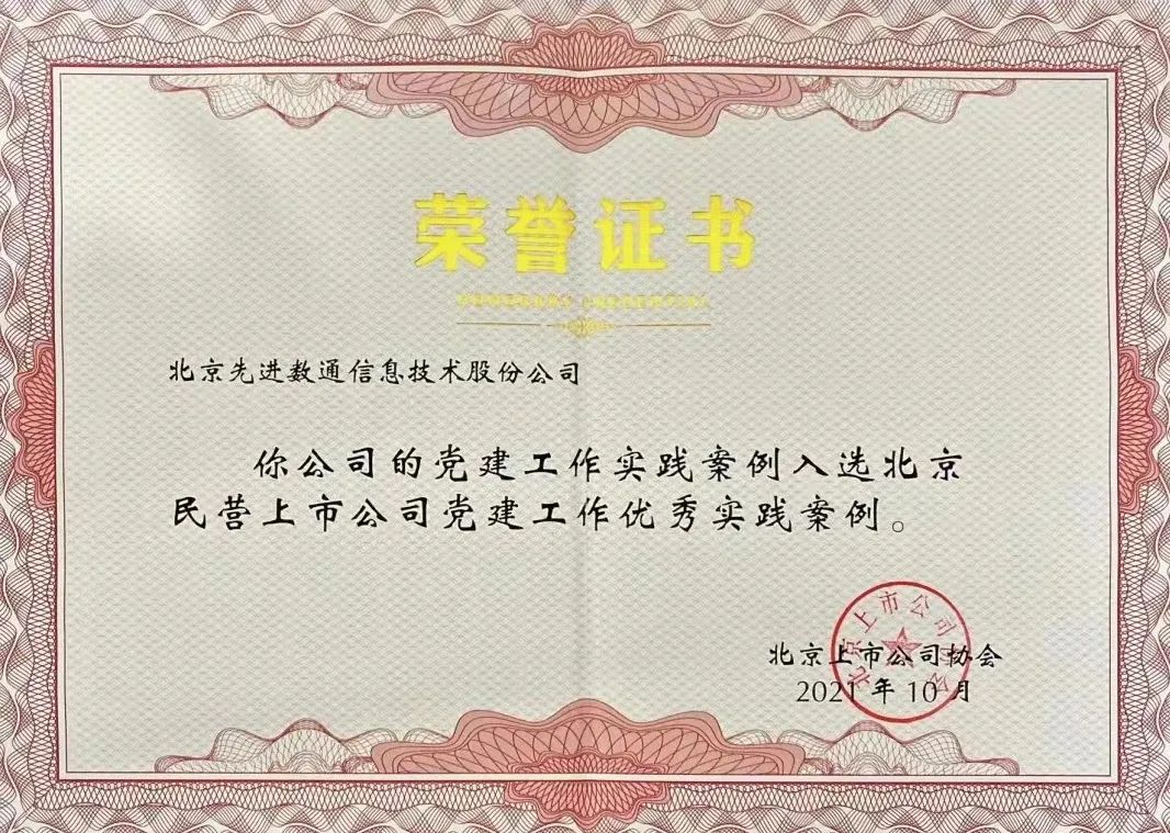 近期,北京上市公司协会授予北京J9国际站 J9 信息技术股份公司荣誉证书,J9国际站 J9 党建工作实践入选北京民营上市公司党建工作优秀实践案例,相关党建活动已收录在《北京民营上市公司党建工作优秀实践案例汇编》。